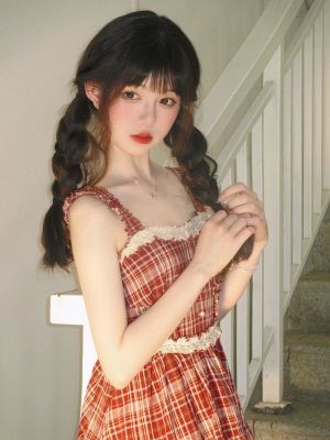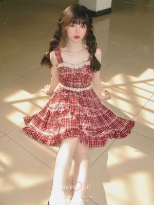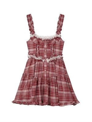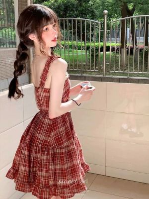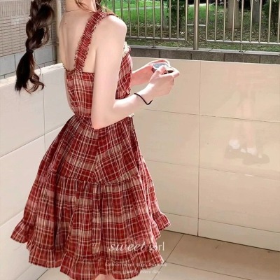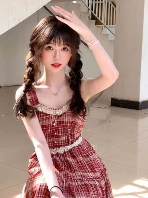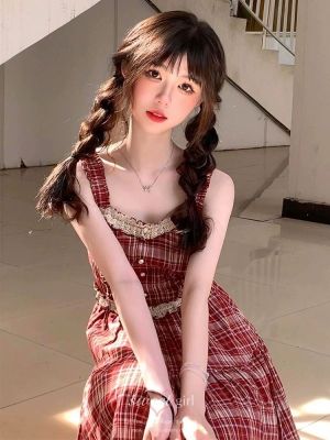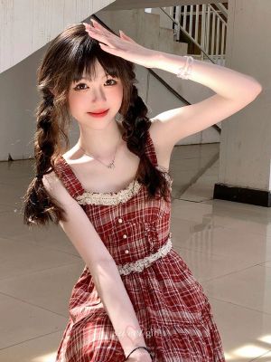 法式復古芭蕾風蕾絲拼接收腰紅色格子吊帶裙女甜辣妹小個子連衣裙