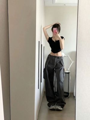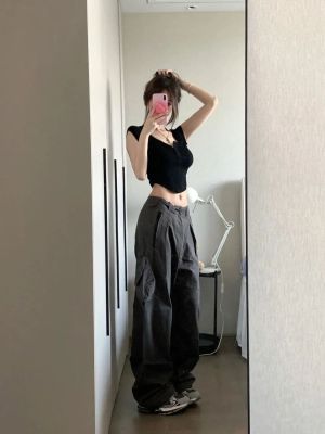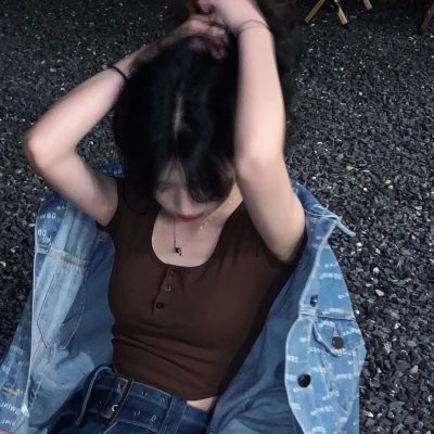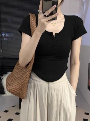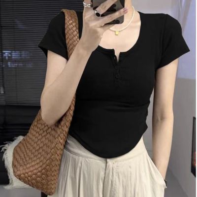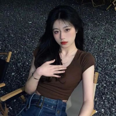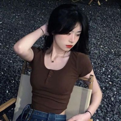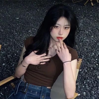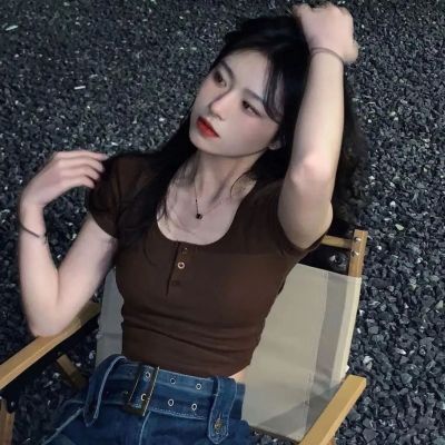 2025 new Hong Kong style retro short-sleeved T-shirt for women in summer brown square collar short top sweet and spicy slim fit to make them look slim and sexy