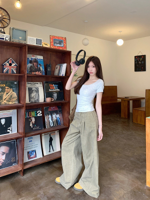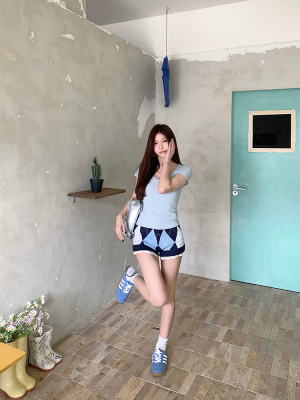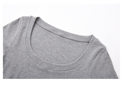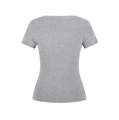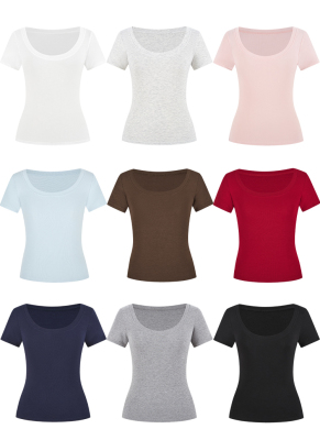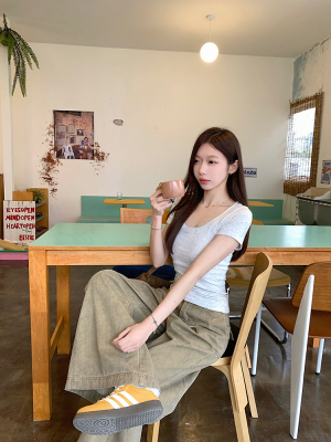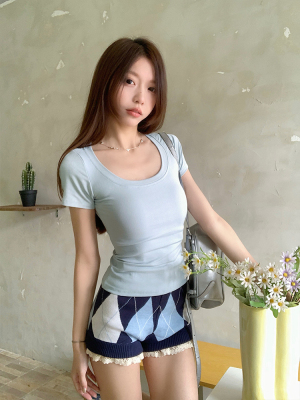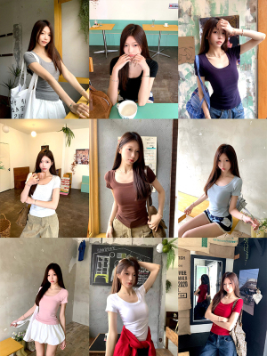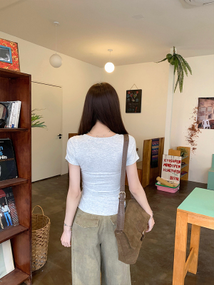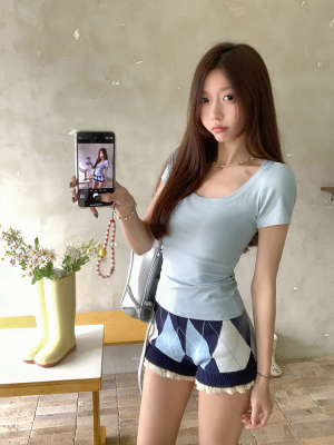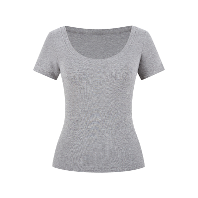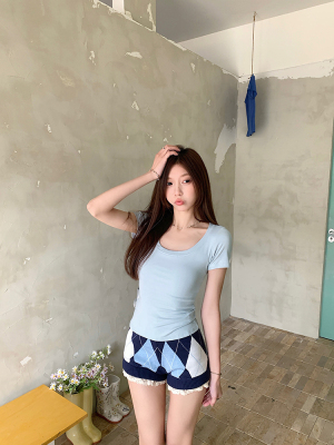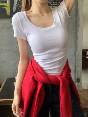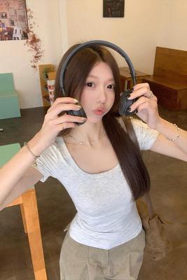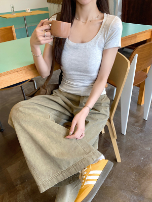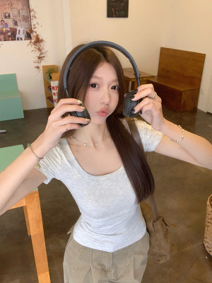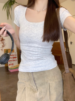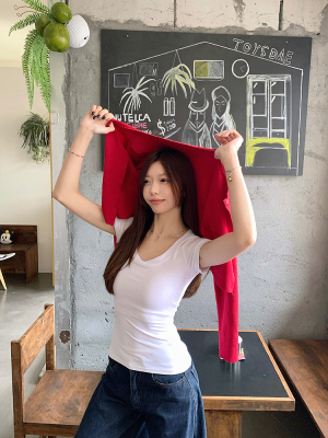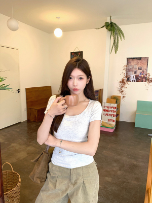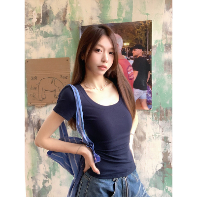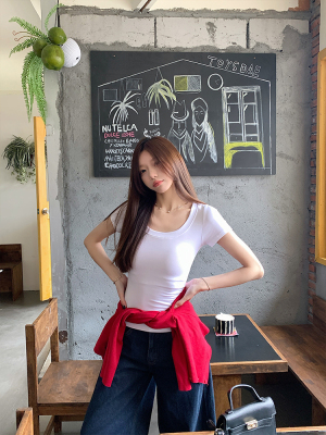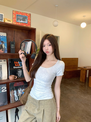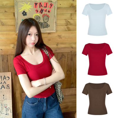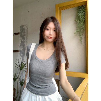 Real shot - Slim U-neck Short-sleeved T-shirt for women with tight 2025 spring and summer meat covering, slim fit and slim top