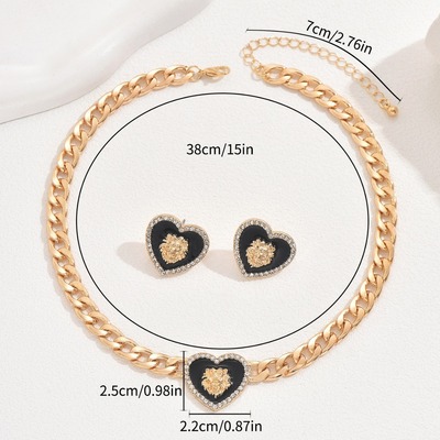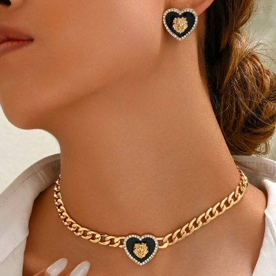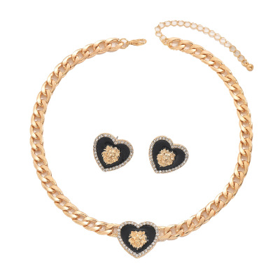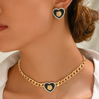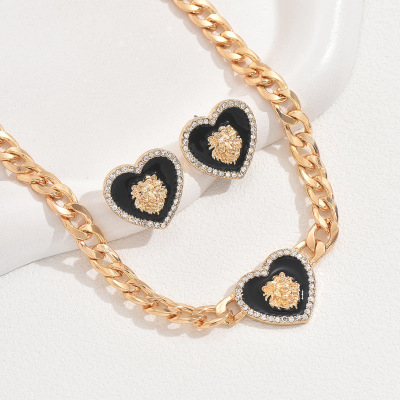 跨境歐美風女士古巴鏈耳環套裝個性愛心獅子鑲鑽設計耳釘長款項鍊