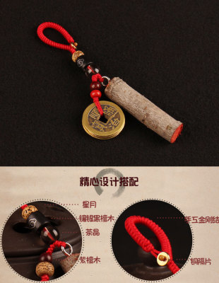 Peach wood branch Five Emperors coins deep coffee keychain