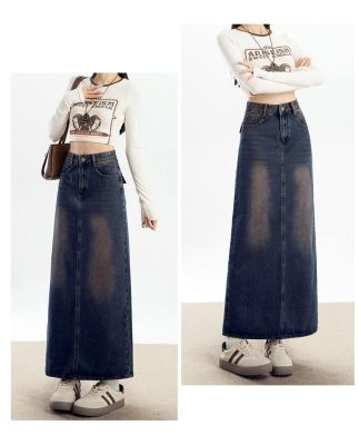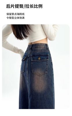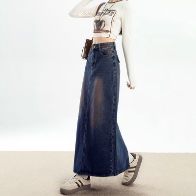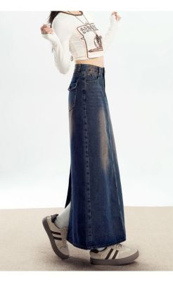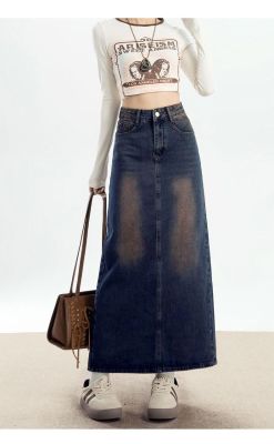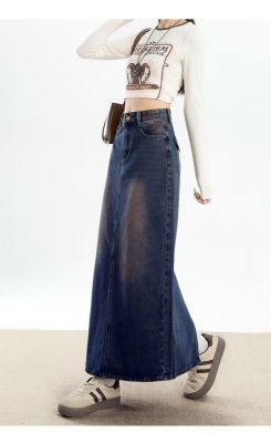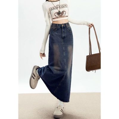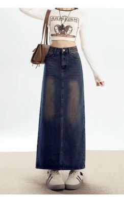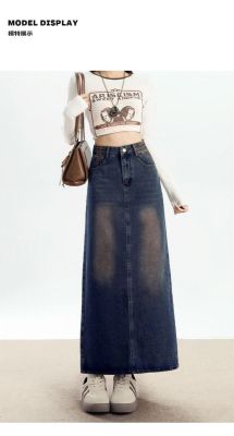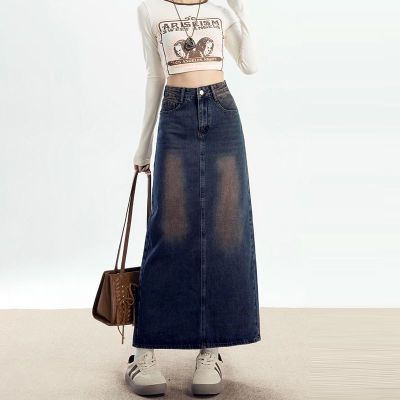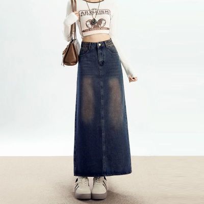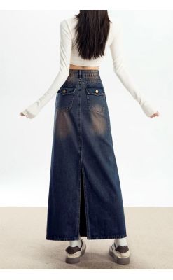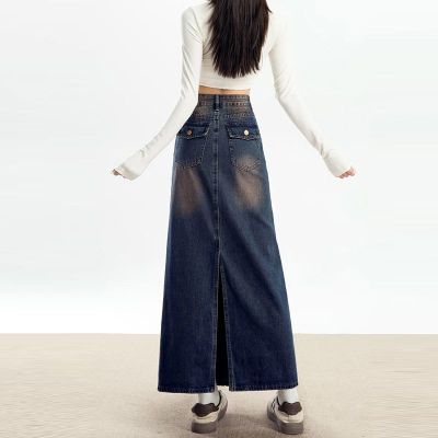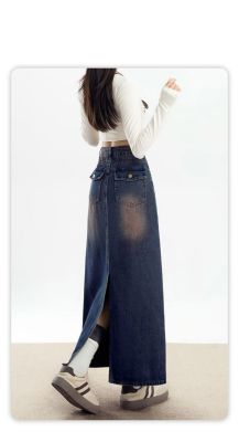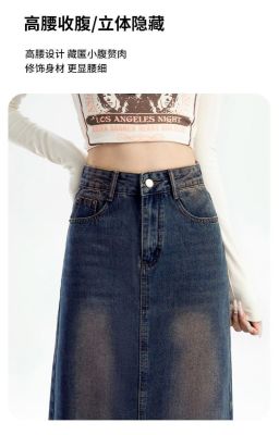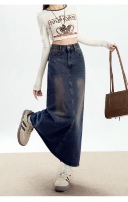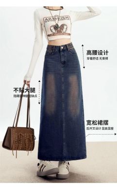 Personalized trendy high-waisted A-line denim skirt for women with spring and summer new style slim and high-slit hip-pack denim skirt