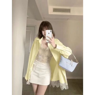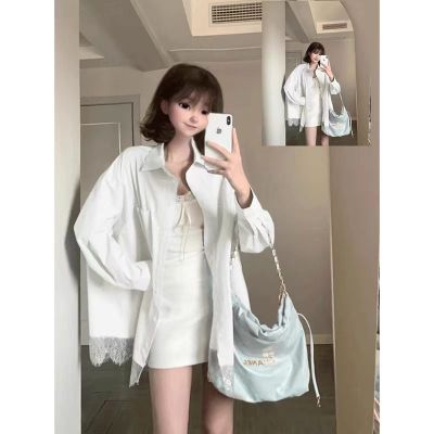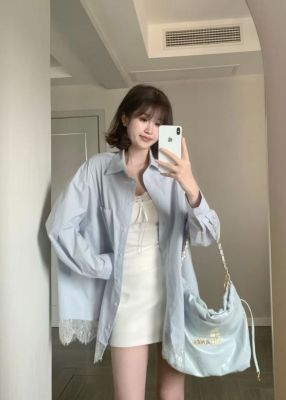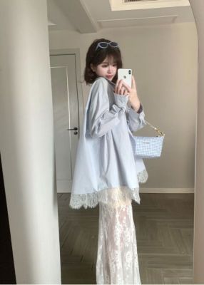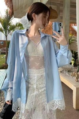 非實拍 法式蕾絲拼接藍色長袖襯衫春夏新款寬鬆外搭襯衣外套
