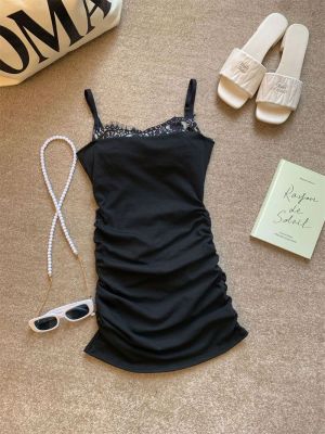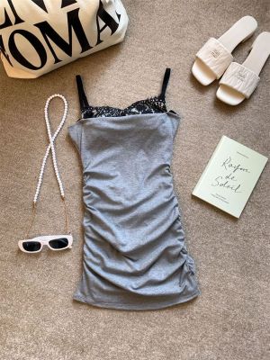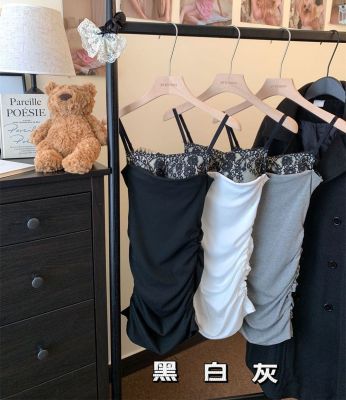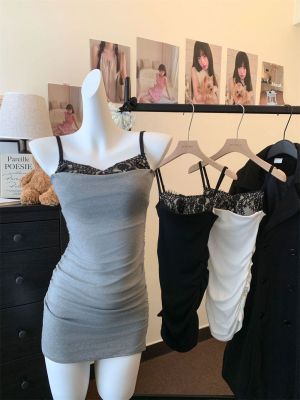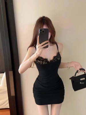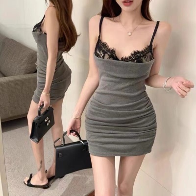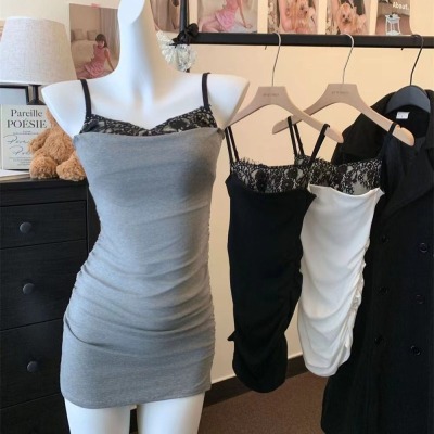 Hot girl sexy women's off-shoulder straps low-cut lace spliced cotton slim suspender hip-pack dress