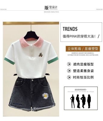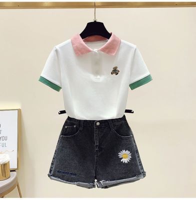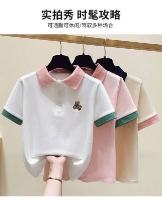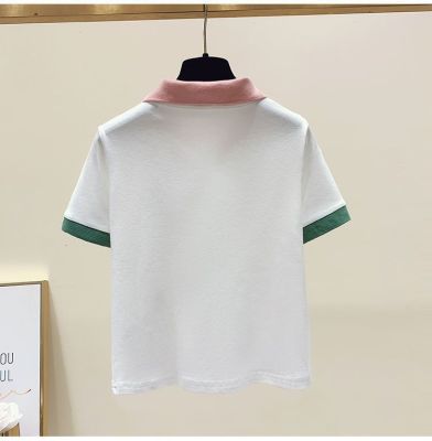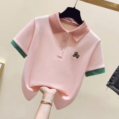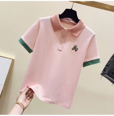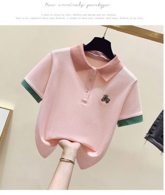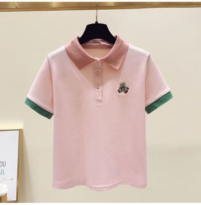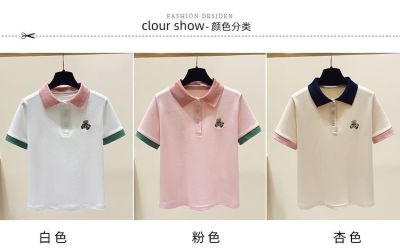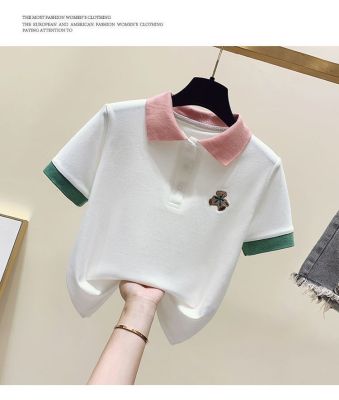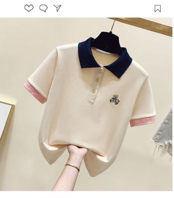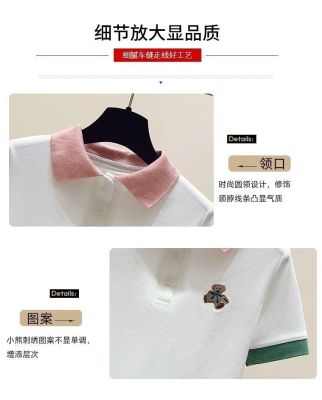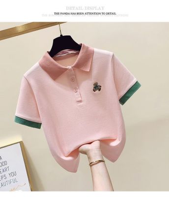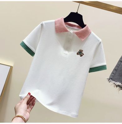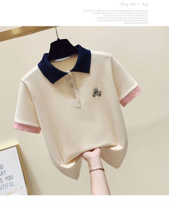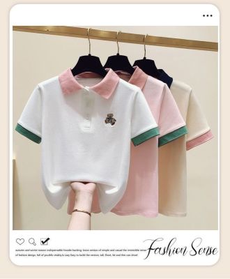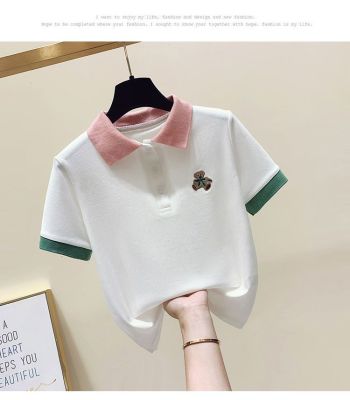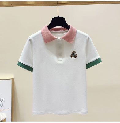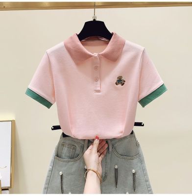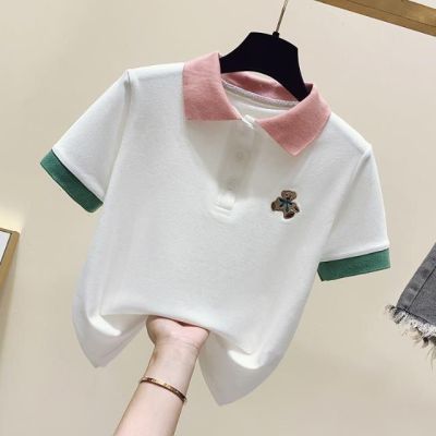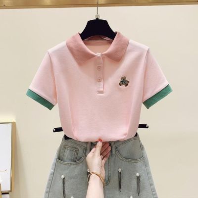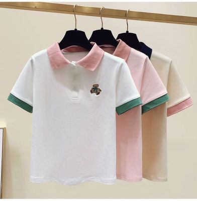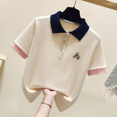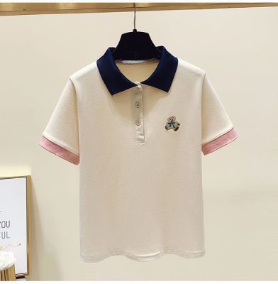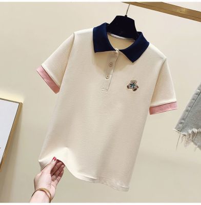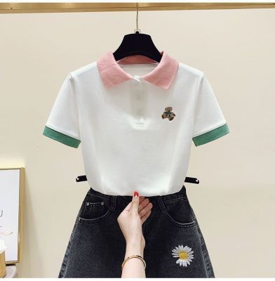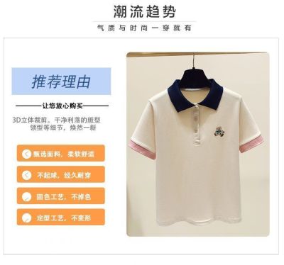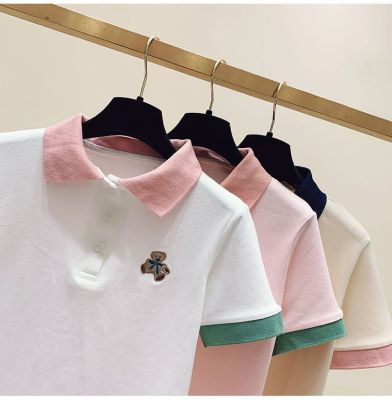 ~polo領刺繡小熊短袖t恤女撞色甜美百搭修身顯瘦上衣ins潮