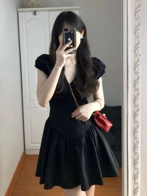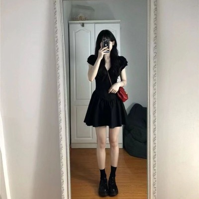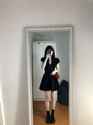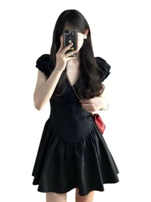新款v領黑色連衣裙子女夏茶歇法式高級感氣質性感顯瘦小個子