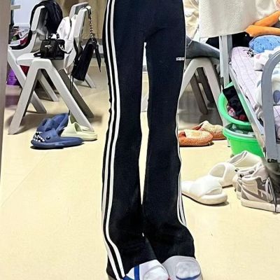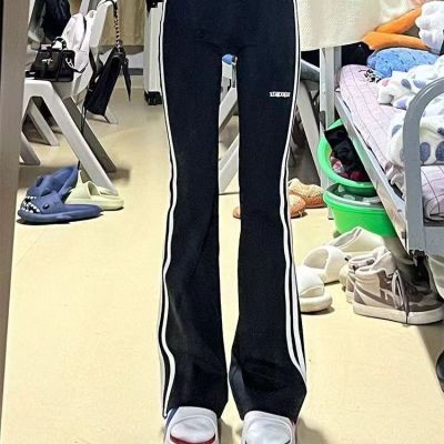 Simple and easy to wear!!! Spliced stripey edgy sporty flared pants for women—Instagram-worthy, casual, and figure-flattering yoga pants for spring.