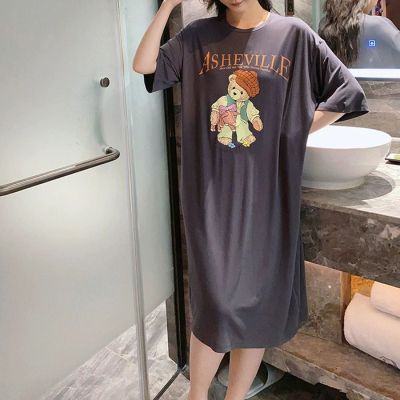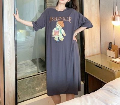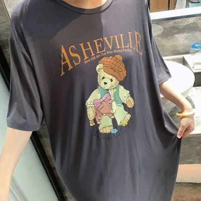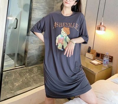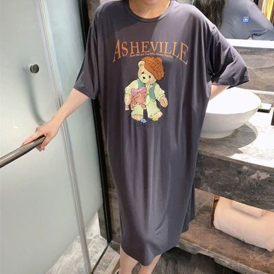 仿棉牛奶絲# 新款夏季卡通印花開叉T恤連衣裙女寬鬆大碼短袖裙子