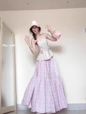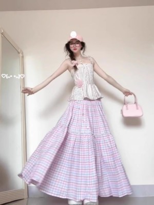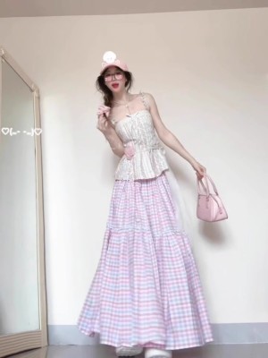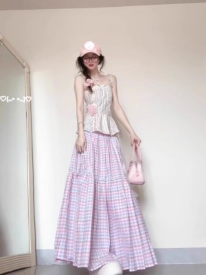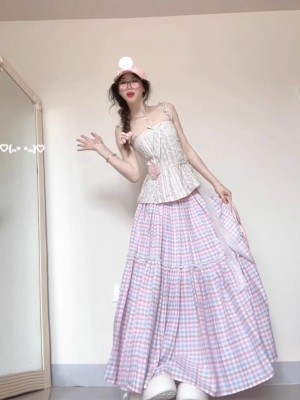 French dopamine color plaid skirt for women in summer gentle and beautiful large umbrella skirt slim A-line long skirt