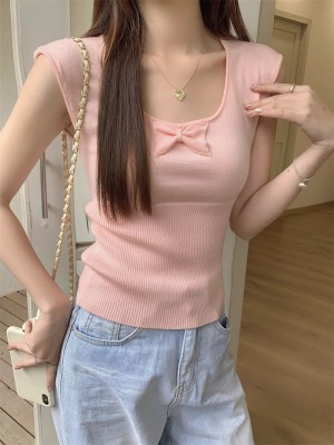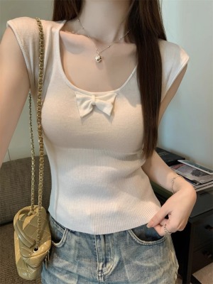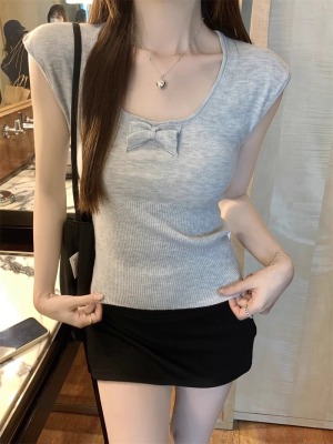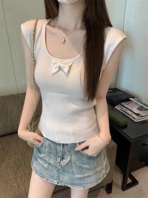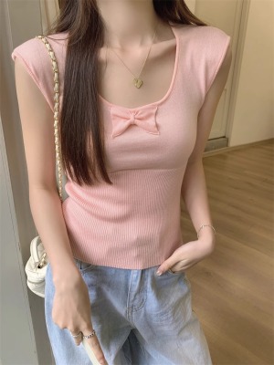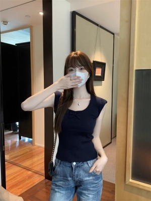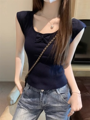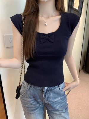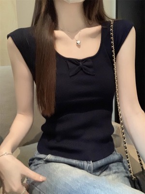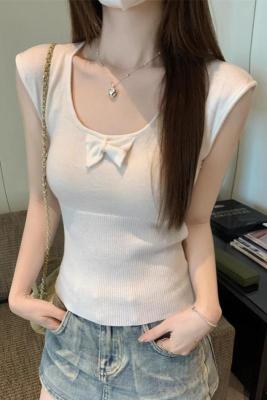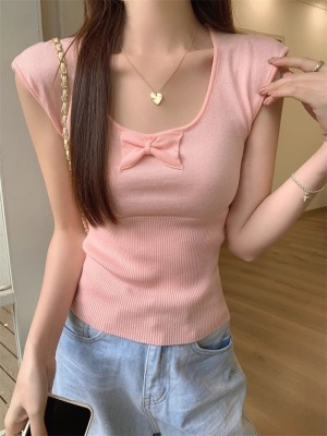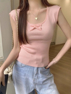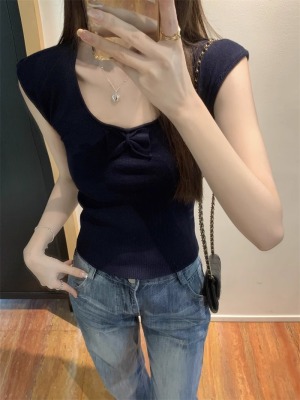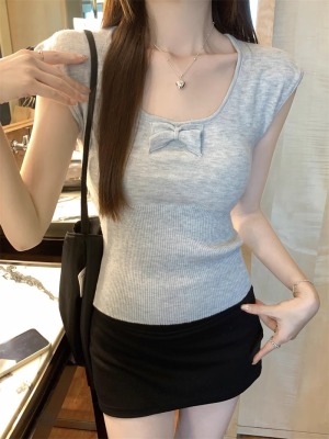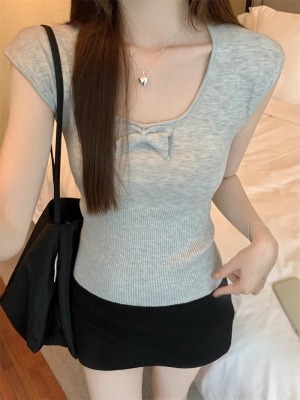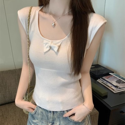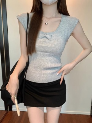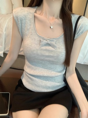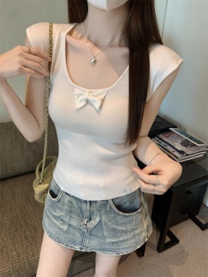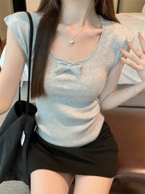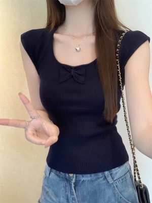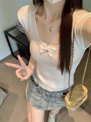 2025夏季新款蝴蝶結針織衫T恤女設計感修身小個子減齡u領短袖上衣