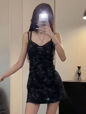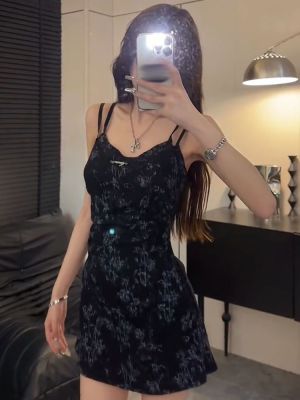 Hot girls fake two-piece tie-dye printed black suspender dress for women in summer design, waist-hugging and slimming A-line short skirt