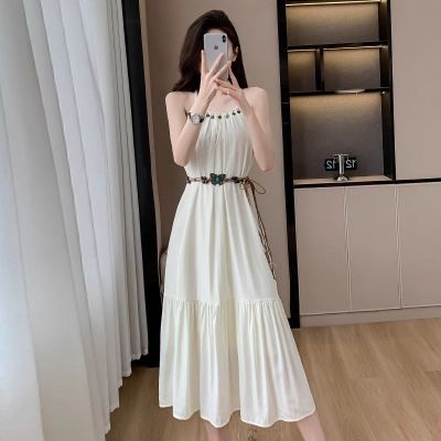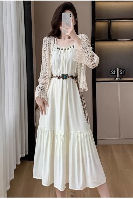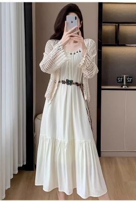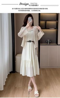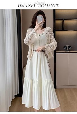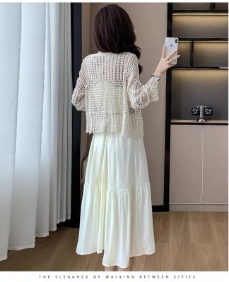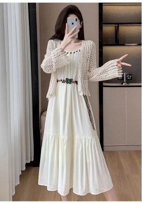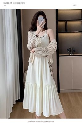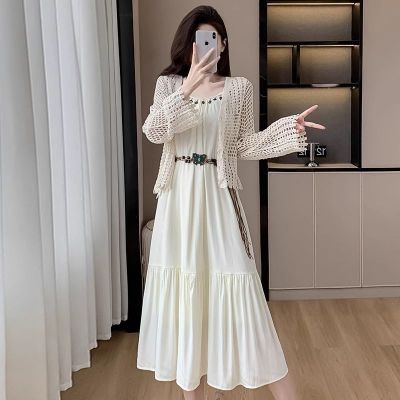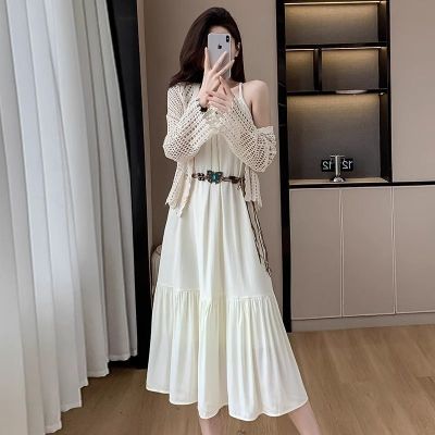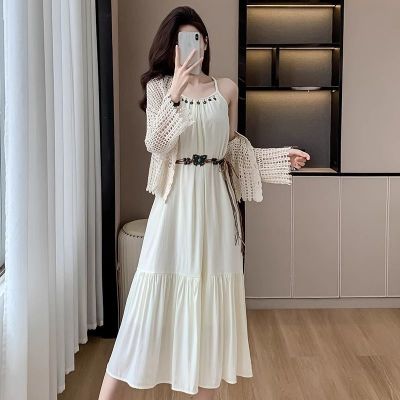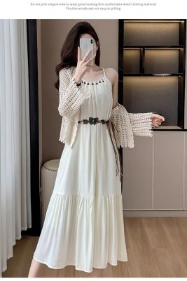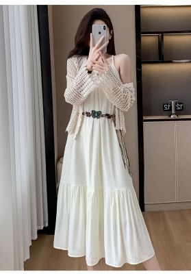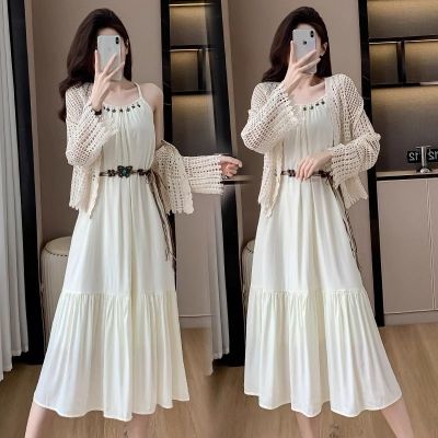 海邊度假風套裝氣質收腰吊帶連衣裙女夏季針織鏤空開衫上衣兩件套
