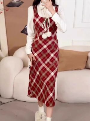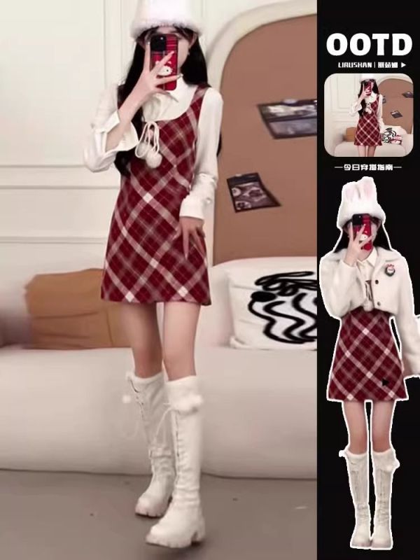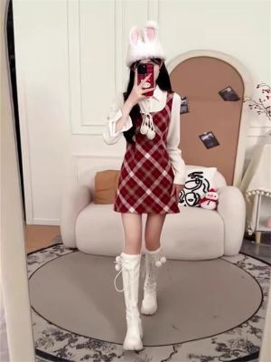 學院風紅色連衣裙2025新款秋冬季女裝法式氣質短裙套裝