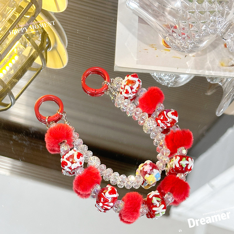新秋冬串珠毛球圈手繪珠雙鏈手機背夾汽車鑰匙扣掛飾包包裝飾批發