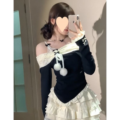 秋冬新款純欲風一字肩拼接上衣甜美顯瘦修身蕾絲蛋糕短裙兩件套裝