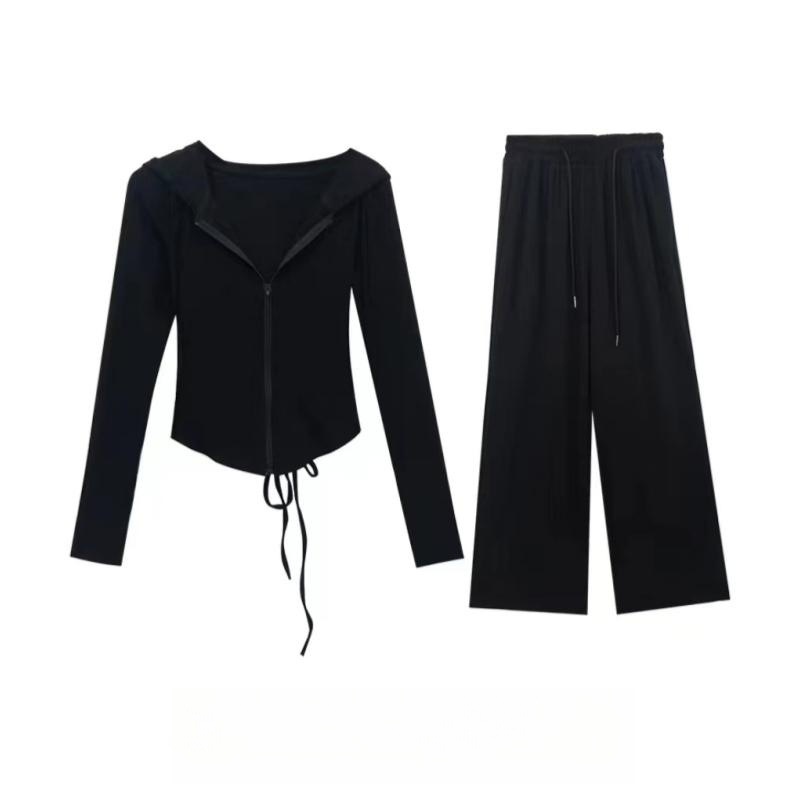 時尚套裝女春秋款2025新款拉鏈上衣闊腿褲黑色休閒運動網紅兩件套