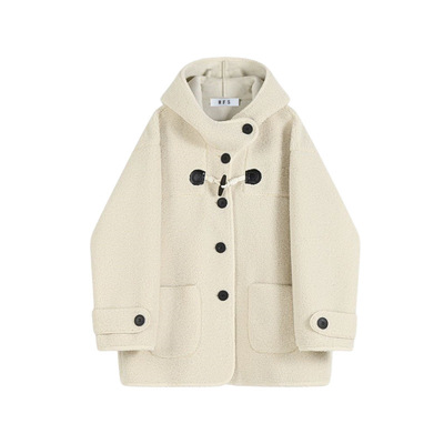 Lazy style hooded lamb fur coat for women in autumn and winter, loose design, horn button coat