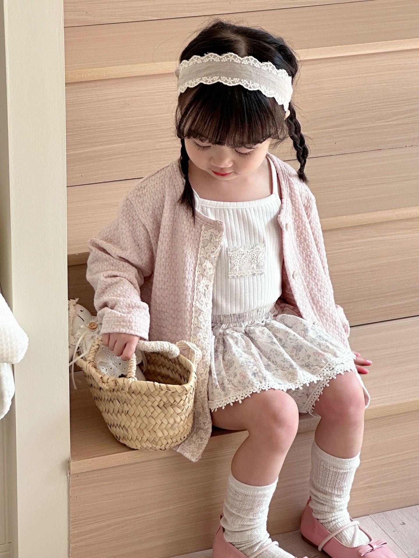 Girls' jacket short skirt Korean style suspender shirt 2025 spring new set knitted versatile solid color printing three-piece set