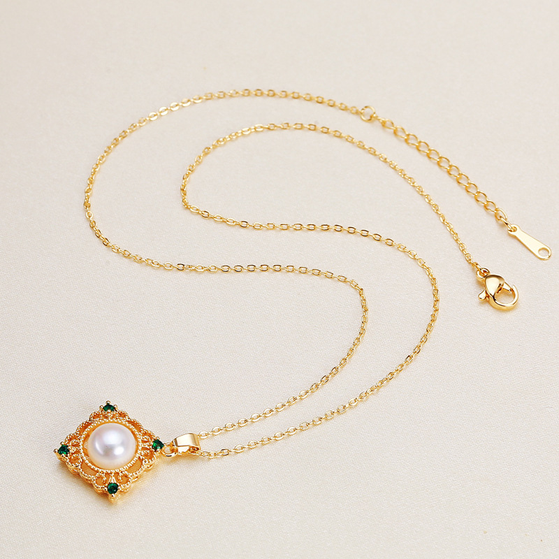 8mm白色饅頭圓珍珠方形鏤空綠鋯石項鍊