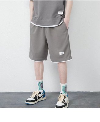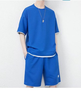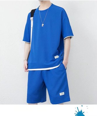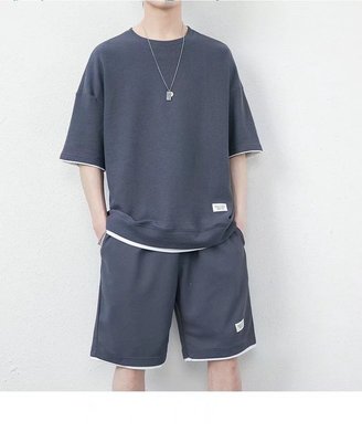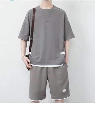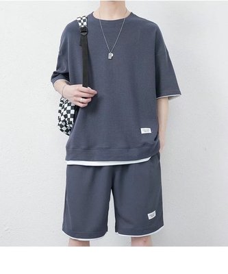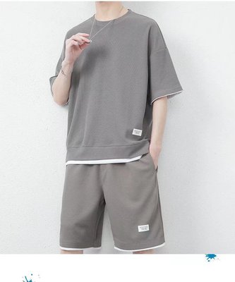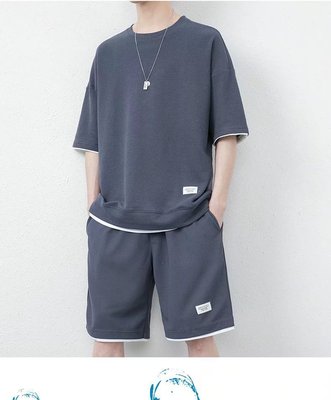 A stylish and trendy summer men's set featuring a waffle casual suit with a cool ice silk short-sleeved T-shirt paired with sporty shorts.