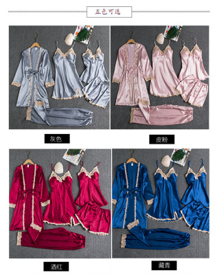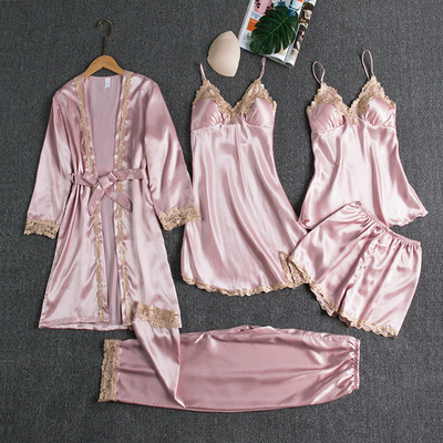 外貿跨境廠家 新款睡衣帶胸墊歐美大碼 金色女士花五件套薄家居服