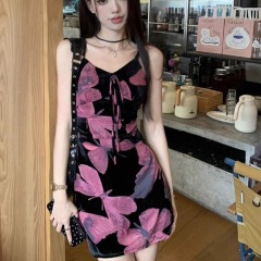 復古蝴蝶印花吊帶連衣裙女夏季性感純欲包臀裙紅色收腰顯瘦短裙子