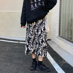 Retro black floral skirt women's autumn and winter mid-length design niche high-waisted style tie-dye skirt