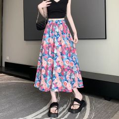 Summer new high-waisted printed cover-up slimming mid-length A-line skirt with large hem for women