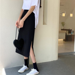 New large size fat mm mid-length A-line skirt with high waist and slit black skirt slimming hip skirt