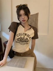 韓國外貿韓版夏季新款坑條辣妹V領短袖T恤女甜辣美式復古短款上衣