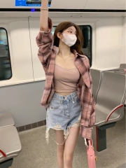 Power style outfit pink plaid shirt women's design sun protection jacket retro suspender cardigan top