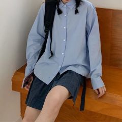 Korean version simple base lined top solid color single-breasted versatile long-sleeved loose shirt student girls blue shirt