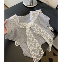 NIMO WANG White Tea Sweetheart Love Hollow Lace Short Sleeve Summer Cool Knitted Top