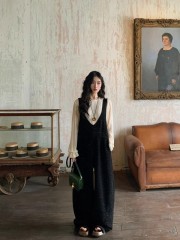 New spring and autumn jumpsuits black small fragrance style versatile overalls retro wide-leg floor-slide pants