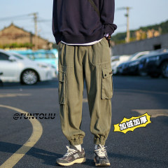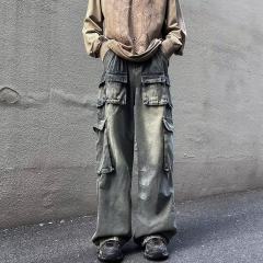 Multi-pocket cargo jeans for men, American retro trendy brand loose wide-leg pants with leggings