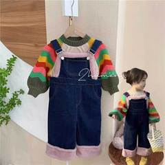 Xihong City 2023 Spring New Korean Girls' Color Block Wave Bell Sleeve Sweater Lamb Fur Denim Overalls