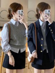 Designed puff-sleeved shirt + irregular knitted vest + high-waisted skirt three-piece set