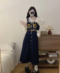 Japanese sweet and cute doll collar plaid shirt corduroy splicing skirt three-piece set