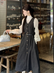 $ 9.80 Sold 4Autumn style OL retro V-neck buttoned long skirt loose slimming high-end suit vest dress