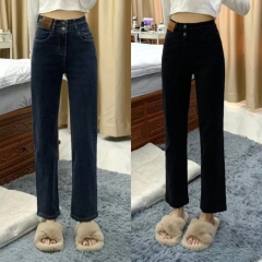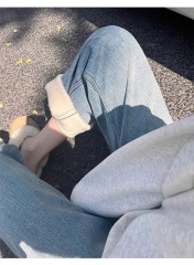 Velvet thickened autumn and winter new retro light blue straight jeans for women loose and drapey high-waisted trousers for small people