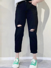 Plus size women's high waist stretch ripped jeans thin loose slimming eight-point straight pants trendy