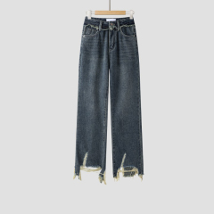 Ready stock ~ Distressed retro wide-leg jeans for women, new high-waisted, loose, slimming, raw-edged straight-leg floor mopping pants