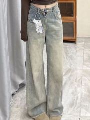 Washed retro wide-leg jeans for women spring and summer new Korean style Hong Kong style loose high-waist slim straight floor-length mopping pants