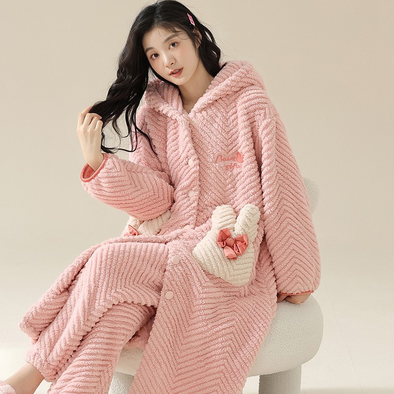 Ladies Fall and Winter Flannel Pajama Set Long Sleeve Thick Fleece Robe Cartoon Nightgown Winter Coral Fleece Autumn and Winter Style
