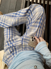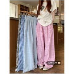外貿原版紐扣版高質量包邊新款藍色格子褲女ins寬鬆顯瘦時尚百搭