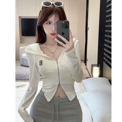 2024秋季新款白色字母刺繡連帽上衣女短款雙拉鏈緊身長袖開衫外套
