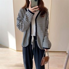 2022 Thin Lazy Retro Versatile Contrast Color Striped Cardigan Autumn Large V-neck Thin Loose Jacket
