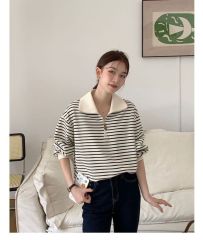 New plus size women's fat mm autumn and winter loose striped lapel sweater versatile long-sleeved pullover jacket