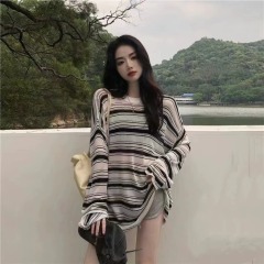 Color super a Korean style casual lazy stripe micro transparent sunscreen loose knit t