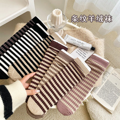 Women's pure color thick ribbed cashmere mid-calf socks, autumn and winter, trendy INS striped college style, factory batch striped cotton socks